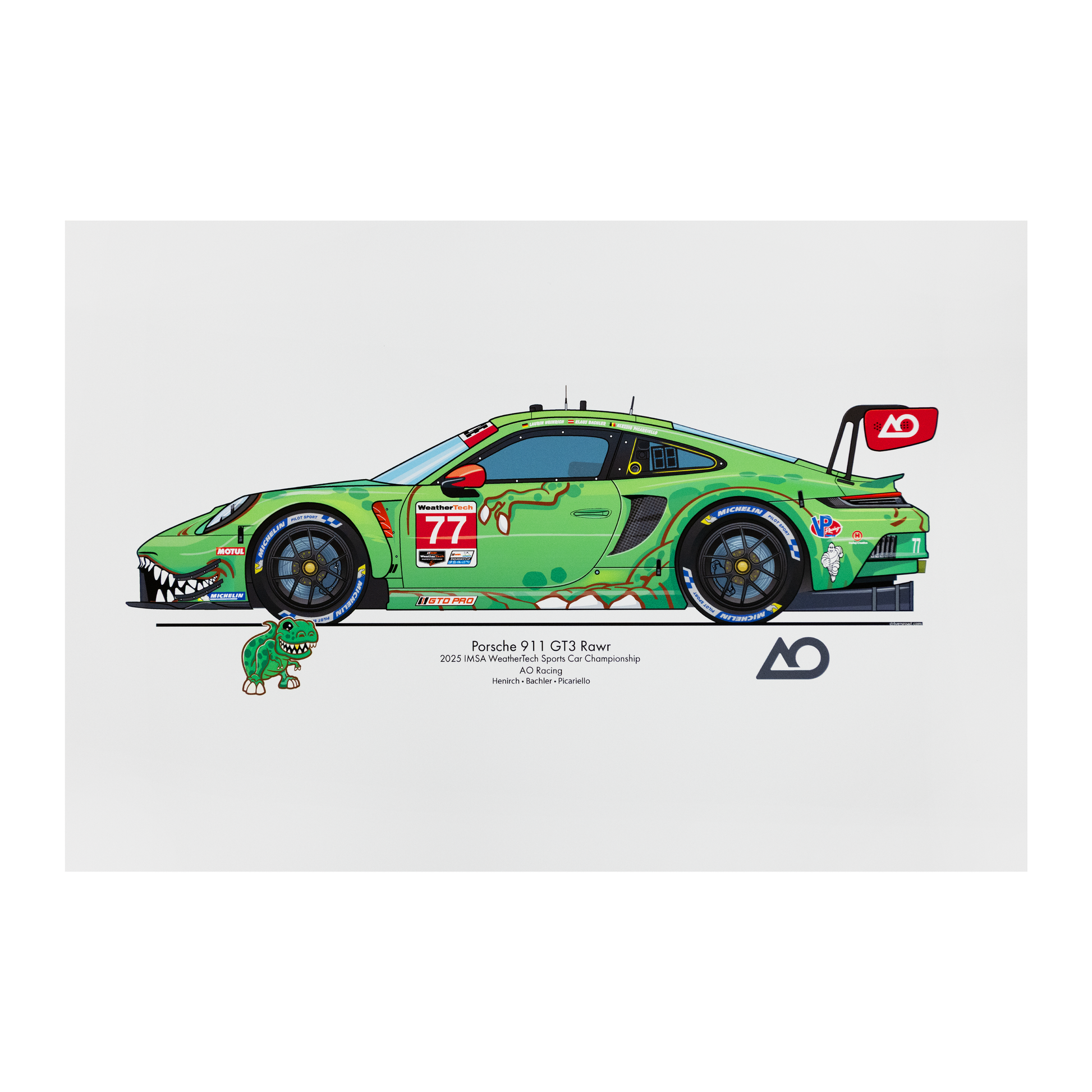 Bring home the roar of the 2025 IMSA season with this detailed 19" x 13.5" print of AO Racing’s fan-favorite, Rexy, the Porsche 911 GT3 Rawr. Illustrated by Steve Petrosky and printed on thick, high-quality cardstock, this artwork showcases all the toothy attitude and dino-powered charm that made Rexy a standout on the grid. A perfect addition to any fan’s collection, this piece celebrates one of the most beloved characters in motorsport with bold color and fierce style.
