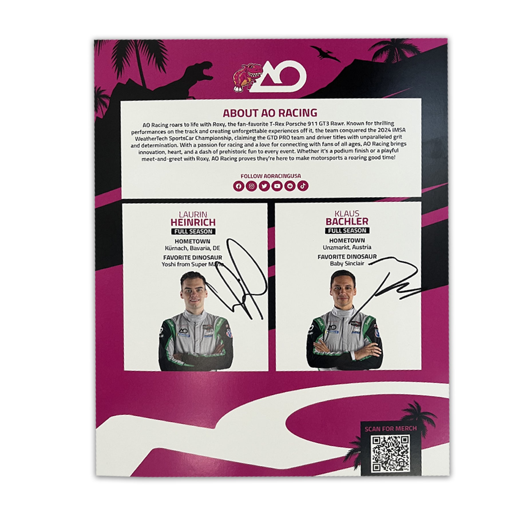 Fresh from the autograph table, get your copy of the 2025 Roxy hero card for Roxy the T-Rex, signed by drivers Laurin Heinrich and Klaus Bachler.