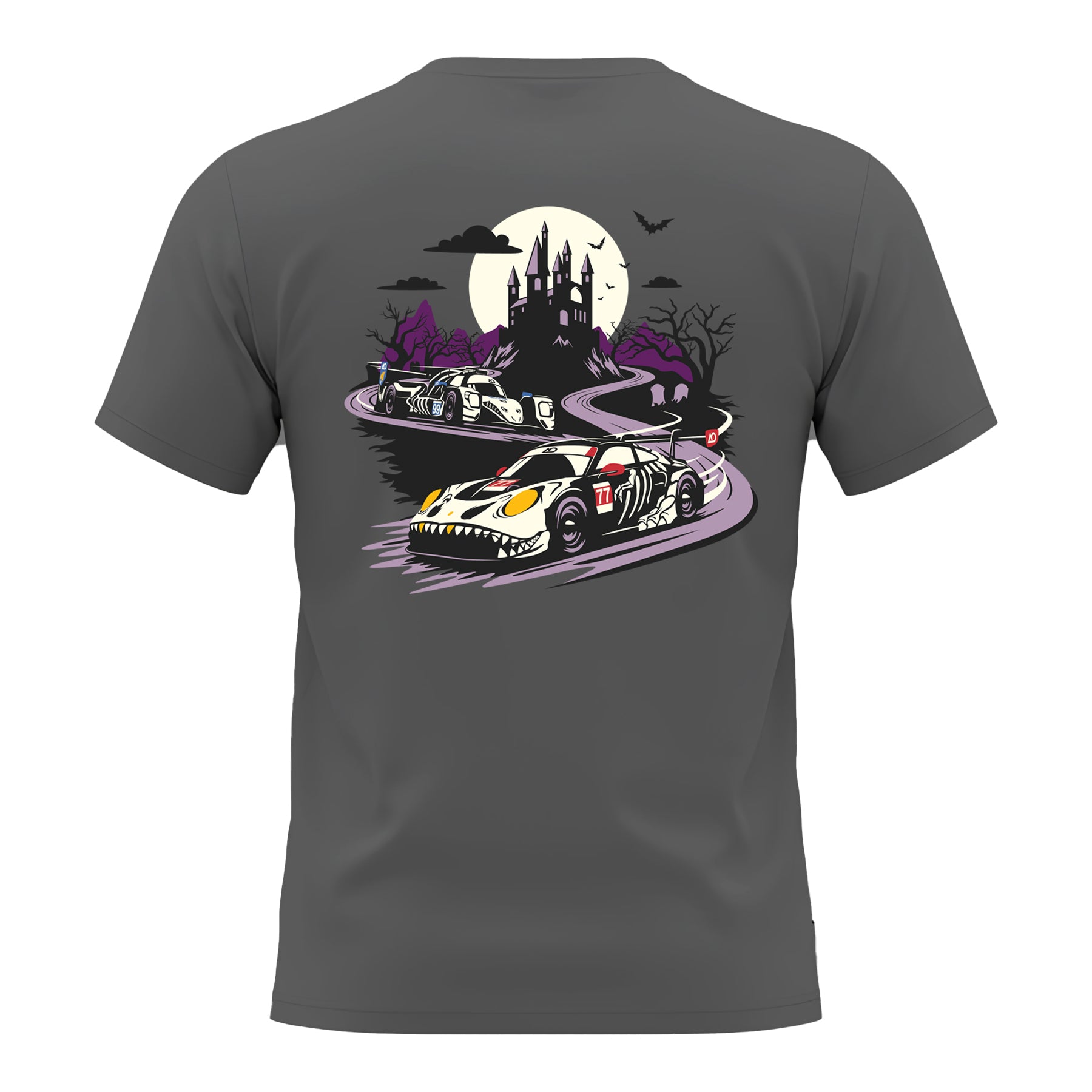 Almost sold out! Printed on a soft charcoal tee, this limited-edition shirt combines AO Racing’s racing spirit with Halloween flair. Whether you’re cheering at Petit Le Mans or trick-or-treating at home, this tee is a must-have for fans of Rexy, Spike, and all things spooky. The front features skeleton-ized Rexy and Spike with an AO bones logo, and on the back, Rexy and Spike’s race cars charge through a haunted landscape under a full moon, complete with spooky trees, bats, and a looming castle. It’s the perfect mix of racing and Halloween vibes!